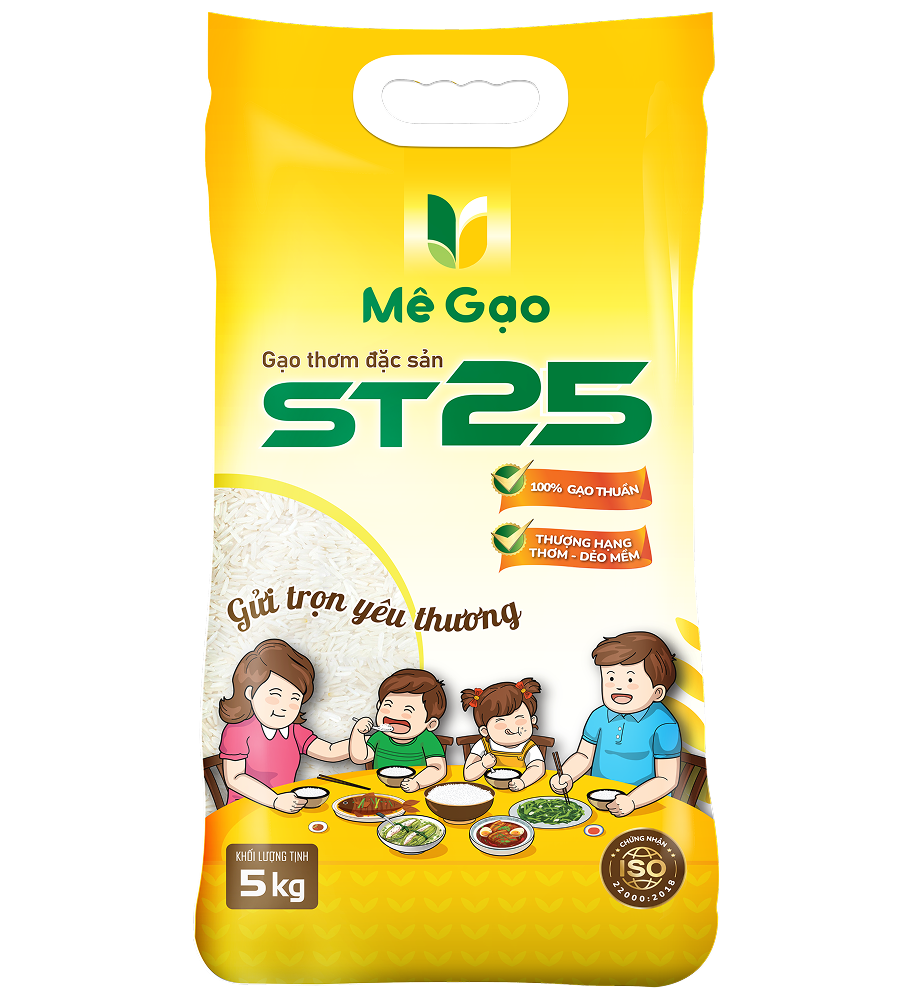 Gạo thơm đặc sản ST25 của Mê Gạo được chế biến từ giống lúa thuần chủng thượng hạng, theo quy trình sản xuất lúa gạo bền vững. Sản phẩm đạt tiêu chuẩn về an toàn vệ sinh thực phẩm FDA, HALAL, HACCP, ISO 22000:2018.